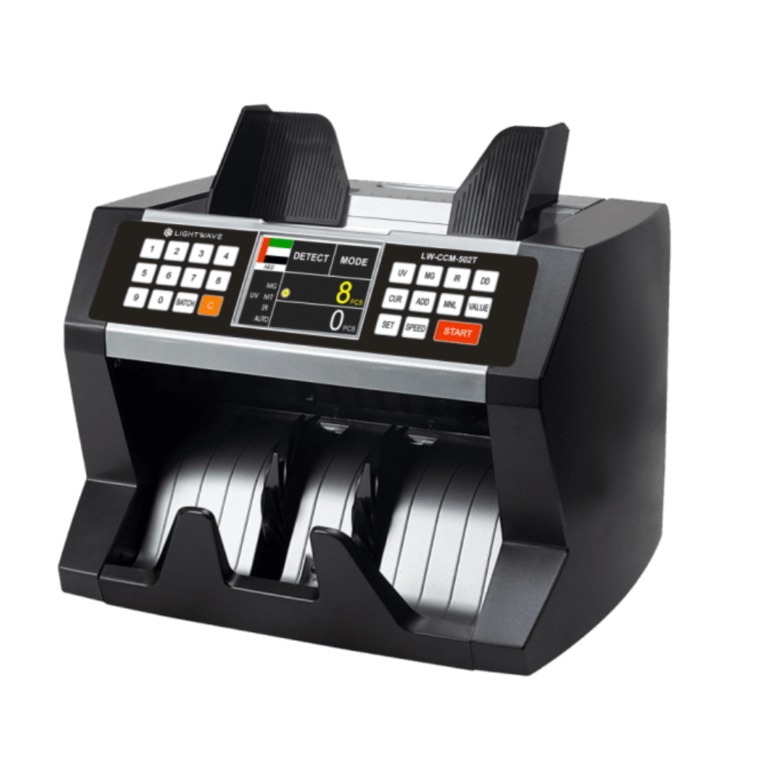 Lightwave LW-CCM-502T Money Counting Machine is an advanced cash handling solution designed to enhance efficiency and accuracy in businesses dealing with high volumes of cash. This sophisticated machine boasts a rapid counting capability of up to 1,200 notes per minute, significantly streamlining cash processing in retail outlets, banks, and other financial institutions.